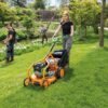 Handling is another key strength. The V-handlebar takes pressure off your wrists, and the vibration damping cuts down the hand-arm buzz you’d normally get from a long day behind a mower. The swivelling frame lets you work cleanly along walls, hedges and paths without constantly shifting your stance. The mono-bar design also makes bag emptying faster, which adds up when you’re clearing 75 litres of grass every few minutes.