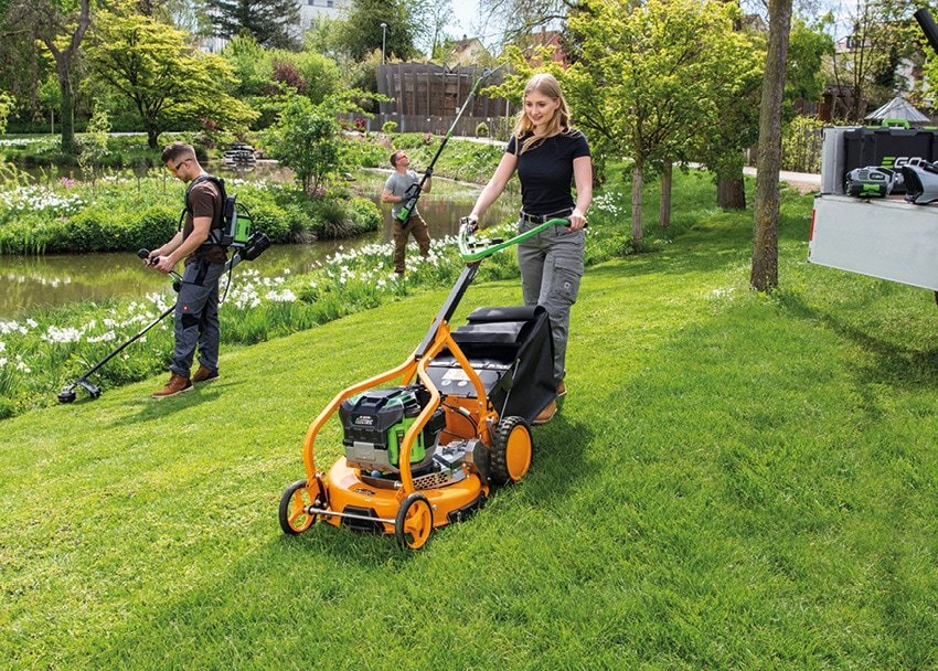 Runtime depends on grass conditions and how much collection you’re doing. Lighter lawns use far less power, while wet or overgrown areas draw more. Using the optional backpack battery gives the longest working window and is the best setup for full-day commercial use.