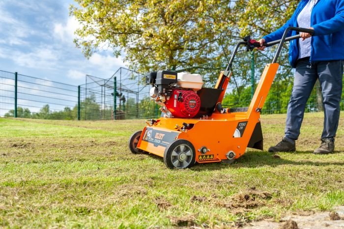 As the blades rotate against the direction of travel, they grip moss and thatch much more efficiently than a conventional scarifier. The blade tips lift the material completely out of the turf and eject it at the rear of the machine.