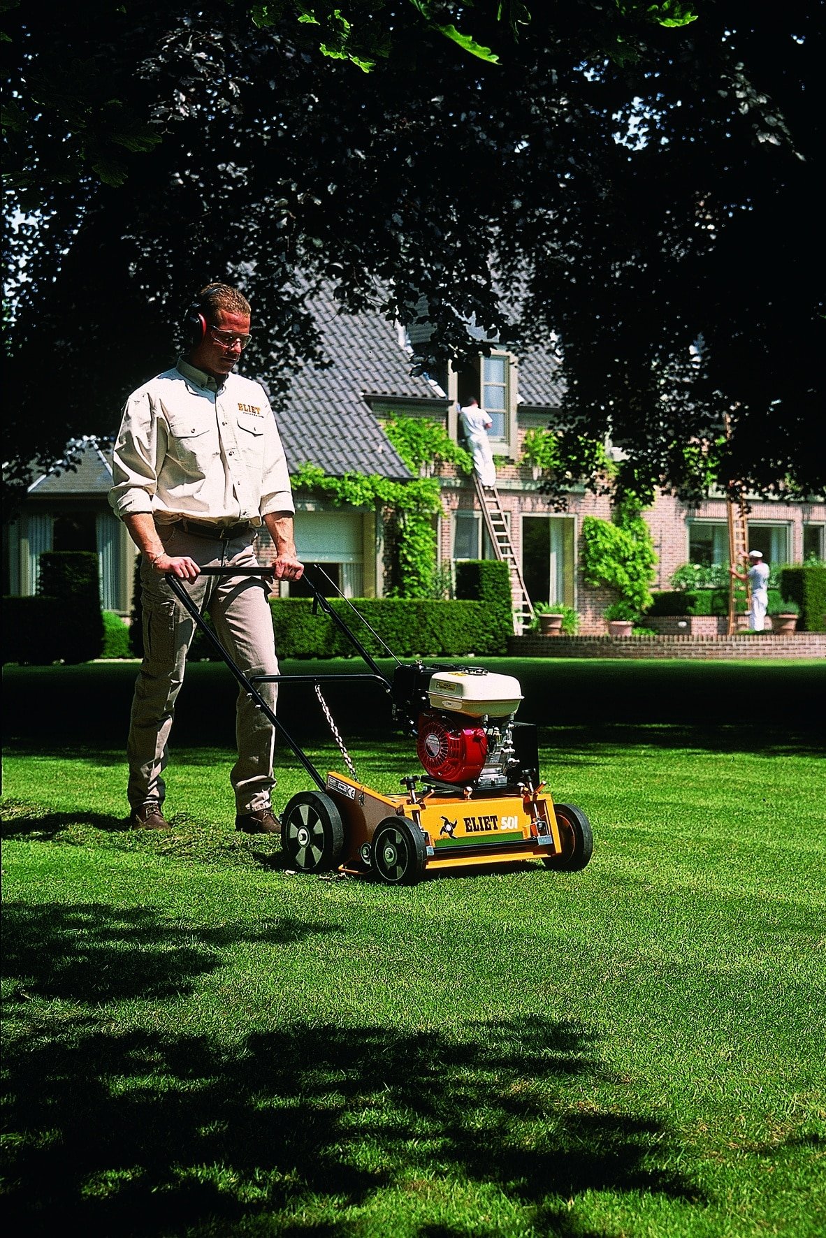 If scarifying takes place in the spring on a swampy lawn, the newly raked moss tends to stick to the wheels so that the machines move up and down when crossing the lawn, with this having a clearly visible effect on the result of the raking. To remedy, ELIET have fitted scrapers to the wheels of its professional scarifiers. Any dirt that sticks to the wheels is immediately removed from the wheels.