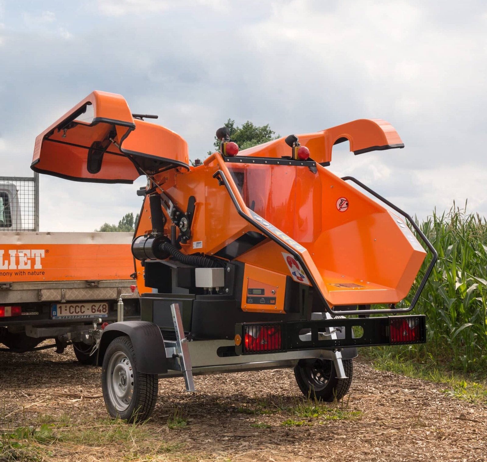In order to deposit the shredded material at the desired location, the discharge chute towers high over the machine. During transport however, the discharge chute creates excessive drag, needlessly increasing vehicle fuel consumption. For this reason, ELIET’s engineers designed the discharge chute to be easy to fold down and secure. This makes for a streamlined machine that is 1.85m high and stays perfectly within the wake of the vehicle.
