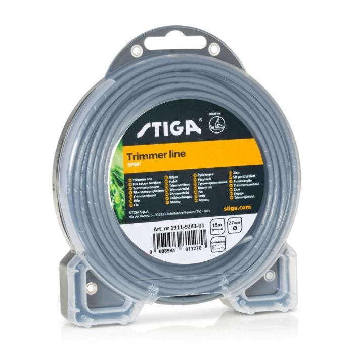 Reel of SP66® corrugated section line with a 2.7 mm diameter for STIGA lawn trimmers and brushcutters. The package contains 15 metres of line. SP66® is the only cutting line developed specifically for battery-powered products. This special product has a very resistant patented composition; in addition, the exclusive aerodynamic profile has a lower air resistance, less vibration and lower decibel emissions. These energy-saving functions guarantee greater life for the battery. To check compatibility contact our customer service team.